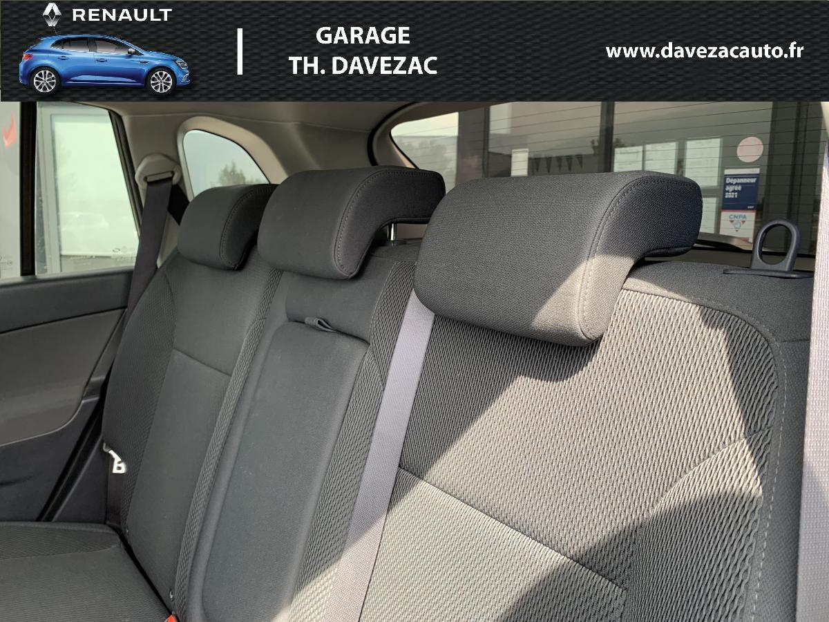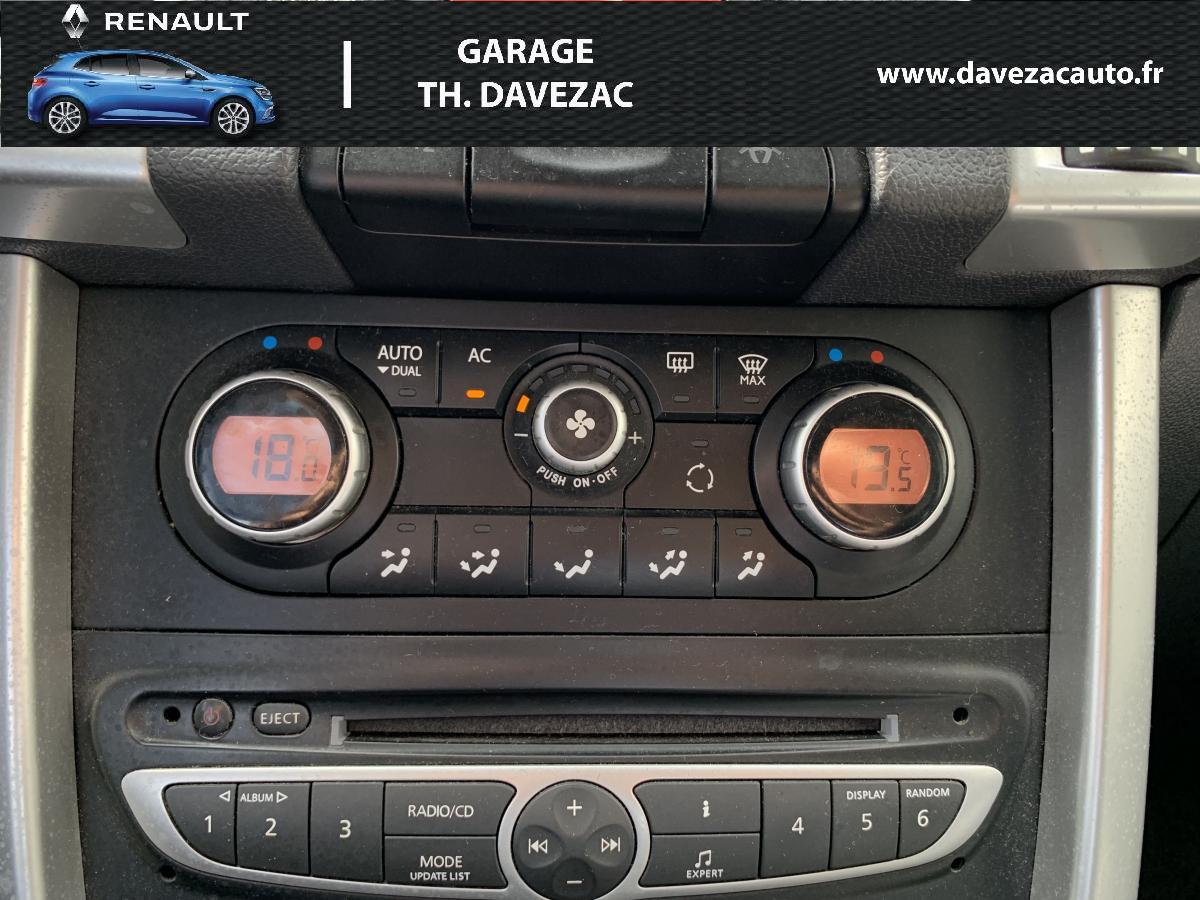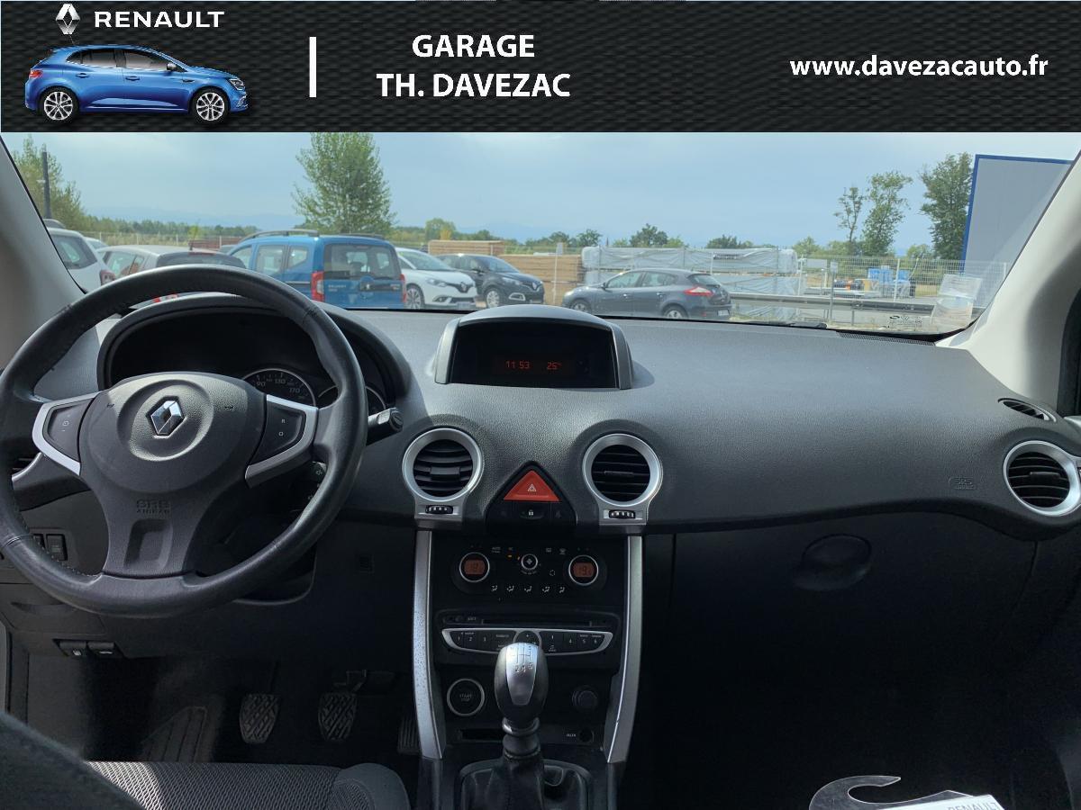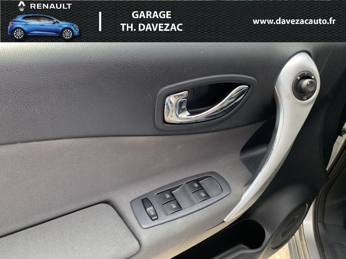 2WD (transmission à 2 roues motrices)ABS et Assistance au Freinage d'Urgence (AFU)Aide au parking avant et arrière (déconnectable, ton carrosserie selon teinte de carrosserie)Allumage automatique des pharesBanquette arrière 1/3-2/3 rabattable et inclinable (5 réglages)Barres de toit longitudinales aluminiumBouton de démarrage “Start/Stop”Carte Renault, accès et démarrage « mains-libres »Climatisation régulée bi-zone avec filtre d'habitacle et fonction recyclage d'airContrôle dynamique de conduite (ESP+CSV)Contrôle dynamique de trajectoire (ESP et ASR)Direction à assistance variable électriqueEssuie-vitre et allumage des feux de croisement automatiqueFrein de parking assistéLève-vitres électriques avant et arrière à impulsion et fonction anti-pincementOrdinateur de bord 7 fonctions (distance parcourue, vitesse moyenne, autonomie de carburant prévisible, consommation totale / moyenne / instantanée, autonomie de vidange)Projecteurs antibrouillard avantRégulateur et limiteur de vitesseRétroviseurs extérieurs électriques, dégivrants et rabattables, ton carrosserie, asphérique coté conducteurRadars de stationnement avant et arrièreRadiosat CD 140w, 6 haut-parleurs, lecture MP3 et satellites de commande au volantRoue de secours (155 / 80 R 17) à usage temporaireRoues aluminium 17"Siège conducteur réglable en hauteurSiège passager avant rabattable en tabletteSystème de fixation ISOFIX 3 points pour siège enfant aux places latérales arrièreSystème Easy-break : plancher plat en une seule manœuvreTrappe à skis dans accoudoir central arrière, amovibleVolant réglable en hauteur et en profondeur
