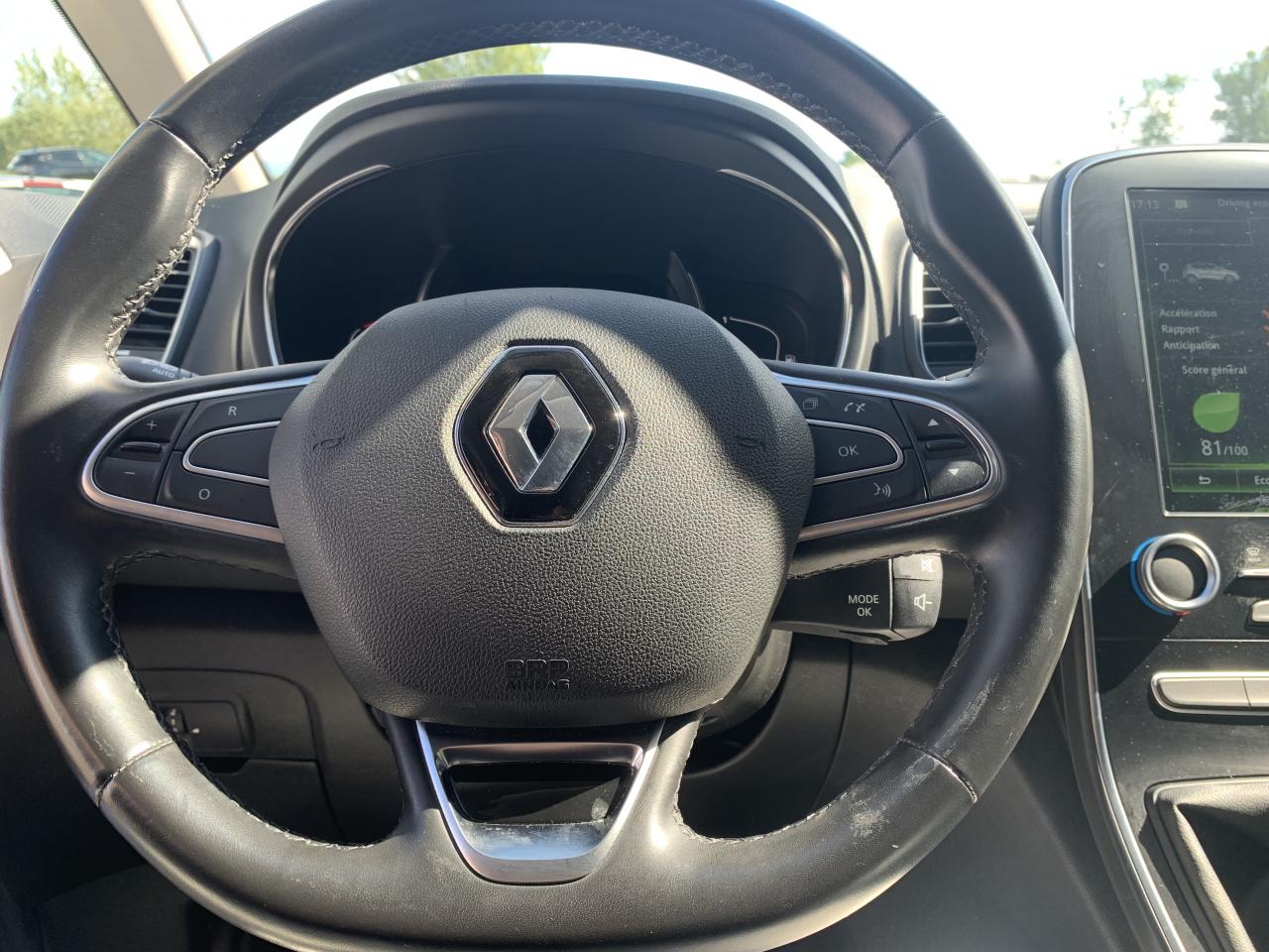 2 liseuses centrales au rang 1 + 2 liseuses latérales au rang 2ABS avec aide au freinage d'urgenceAccoudoir central arrière escamotableAide au démarrage en côteAirbags frontaux conducteur et passager adaptatifsAirbags latéraux (thorax / bassin) avantAirbags rideaux de têtes aux places avant et arrièreAlerte de survitesse avec reconnaissance des panneaux de signalisationAlerte distance de sécuritéBanquette arrière rabattable 1/3-2/3 coulissante rabattable en plancher platCarte Renault avec accès et démarrage mains-libres avec fermeture à l’éloignementClé rétractable 3 boutonsCommandes de l'autoradio au volantCommutation automatique des feux de croisement et de route, Light AssistCompteurs et jauges TFT 7“ avec matrice couleur reconfigurablesCondamnation automatique des ouvrants en roulantConsole centrale coulissante Easy Life avec accoudoirContrôle dynamique de trajectoire (ESP)Coques de rétroviseurs noiresFeux de jour à LEDFeux de jour arrière LED 3D Edge LightFreinage actif d‘urgence Inter Urbain / City / PiétonsIndicateur de changement de vitessesJantes alliage 20“ ExceptionLève-vitres avant et arrière électriques, à impulsion avec dispositif anti-pincementMiroir de surveillance enfantsMise en tablette du siège passager avantMode EcoModularité One-TouchOrdinateur de bordPlancher du coffre repositionnable en 2 positions et inclinablePrises 12 V à l'avant et à l'arrièreProjecteurs antibrouillardProjecteurs avant Full Led Pure VisionRégulateur et limiteur de vitesseRenault MULTI-SENSE (choix des modes de conduite)Répétiteurs de clignotant à LED intégrés aux rétroviseursRétroviseur intérieur électrochromeRideaux pare-soleilSécurité enfant aux portes arrièreSellerie mixte similicuir / Carbone FoncéSéquence d‘accueil à l‘approche du véhicule avec éclairage de signature lumineuse, éclairage de sol et de l'ambiance lumineuse intérieureSiège conducteur à réglage en hauteurSiège conducteur à réglage lombaireSiège passager avant avec réglage lombaireSiège passager réglable en hauteurStop & StartSystème "Follow me home" (phares à extinction temporisée)Tablettes Easy Life au dos des sièges avantTiroir Easy Life (éclairé et réfrigéré)Trappes de rangement sous les pieds avant et arrièreUne prise 12V dans le coffre